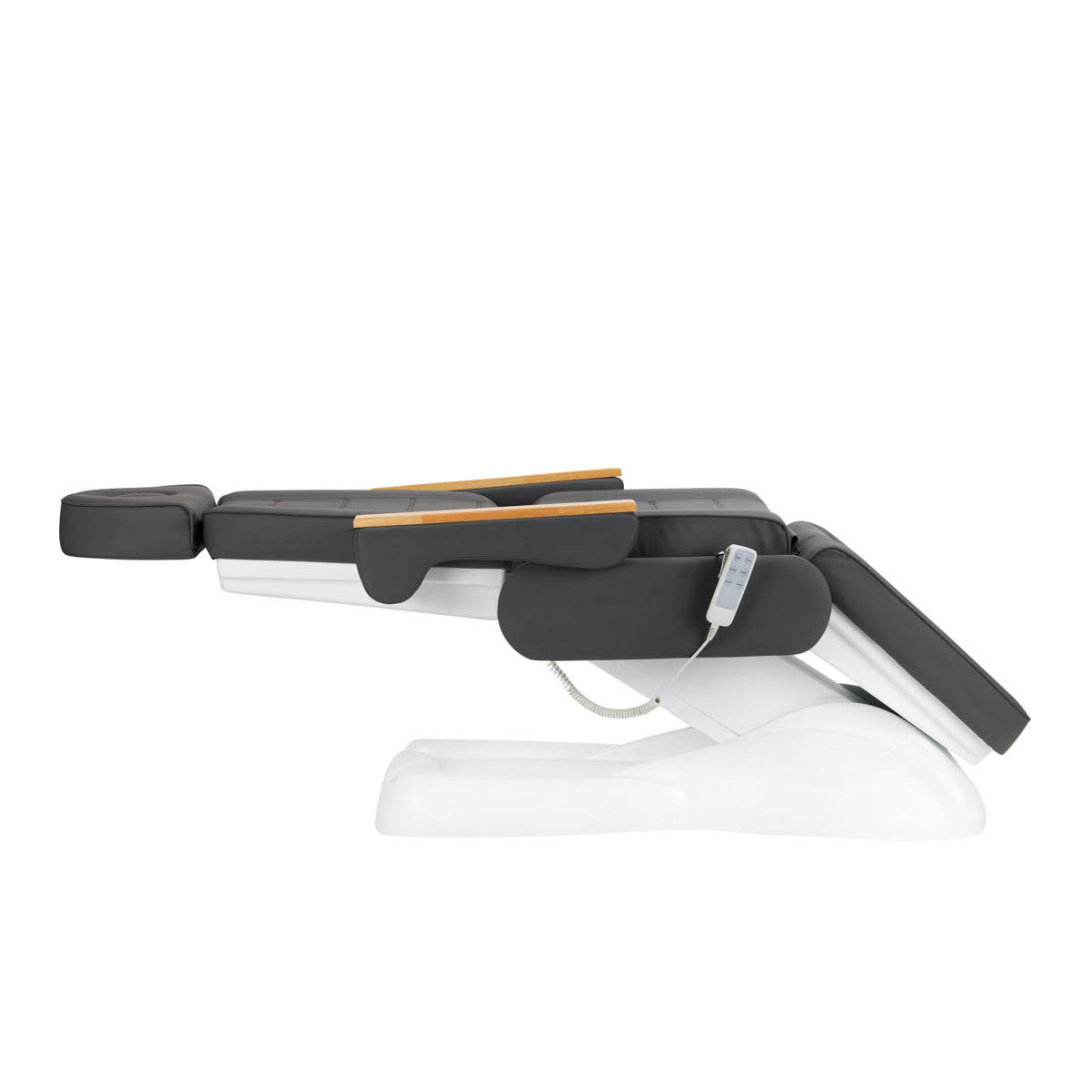 Funktionen für einfache Nutzung Die Sitzhöhe ist im Bereich von 65 cm bis 84 cm verstellbar, und bei vollständiger Ausklappung erreicht der Stuhl eine Länge von über 2 Metern. Diese Maße ermöglichen eine einfache Nutzung für Personen unterschiedlicher Größe und passen den Stuhl an die Bedürfnisse sowohl des Kunden als auch der behandelnden Person an. Auf der rechten Seite des Sitzes ist ein spezieller metallischer Halter für die Fernbedienung montiert, was die Aufbewahrung erleichtert und sie stets griffbereit hält.