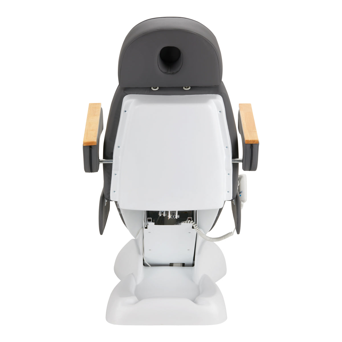 Eine stabile Basis aus langlebigem Material in Weißtönen gewährleistet Stabilität während der Behandlungen. Dekorative Holzelemente an den Armlehnen heben den Stuhl unter anderen modeli hervor und bilden einen visuell ansprechenden, eleganten Akzent. Gut geformte Kanten verleihen dem Stuhl ein stilvolles Aussehen und machen die Sitzfläche ergonomisch.