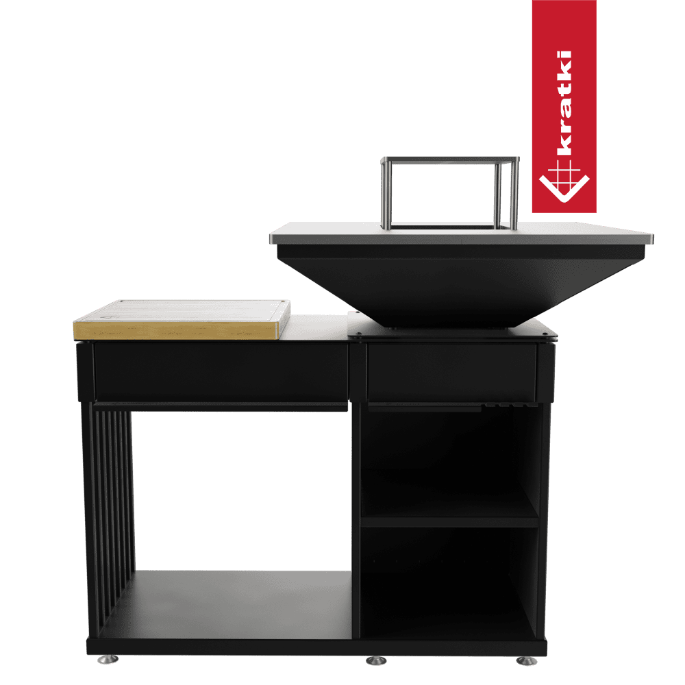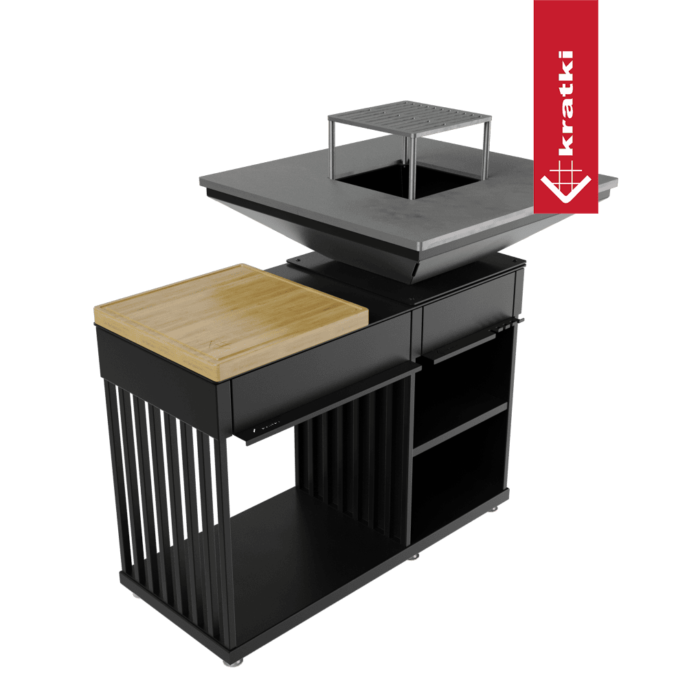 Kratki Kamin QUADRUM mit Grill mit Holzplatte
