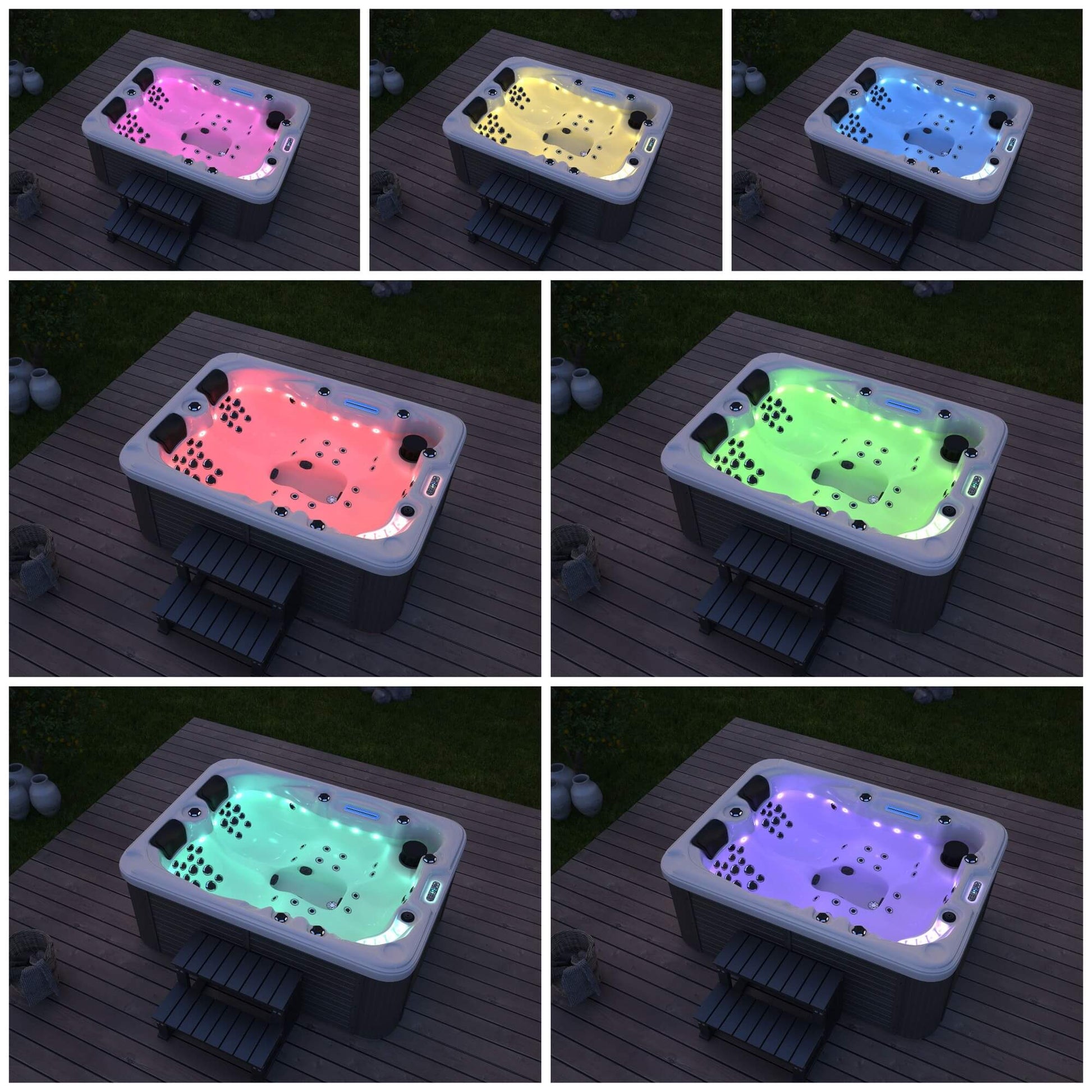 Durch die kompakte Größe passt der Pool in fast jeden Garten. Auch auf Terrassen oder in Wintergärten kann der optisch und technisch hochwertige Whirlpool platziert werden. 24 Lichtquellen wirken ähnlich wie eine Farblichttherapie und lassen sich optional zu - oder abschalten. Neben der normalen Unterwasserbeleuchtung gesellen sich weitere LEDs am Rand hinzu. Du kannst nicht nur im Sitzen, sondern auch im Liegen entspannen. Zwei schwarze Kopfstützen sorgen dabei für eine bequeme Kopfposition. Durch das eingebaute Display am Rand des Whirlpools lassen sich verschiedene Funktionen regeln. Du kannst hier nicht nur die Temperatur einstellen, sondern auch die Massagedüsen und das Licht steuern. Die Zirkulationspumpe kann manuell auf zwei verschiedene Geschwindigkeiten gestellt werden. Zusätzlich erhältst du von uns ein passendes Filterset.