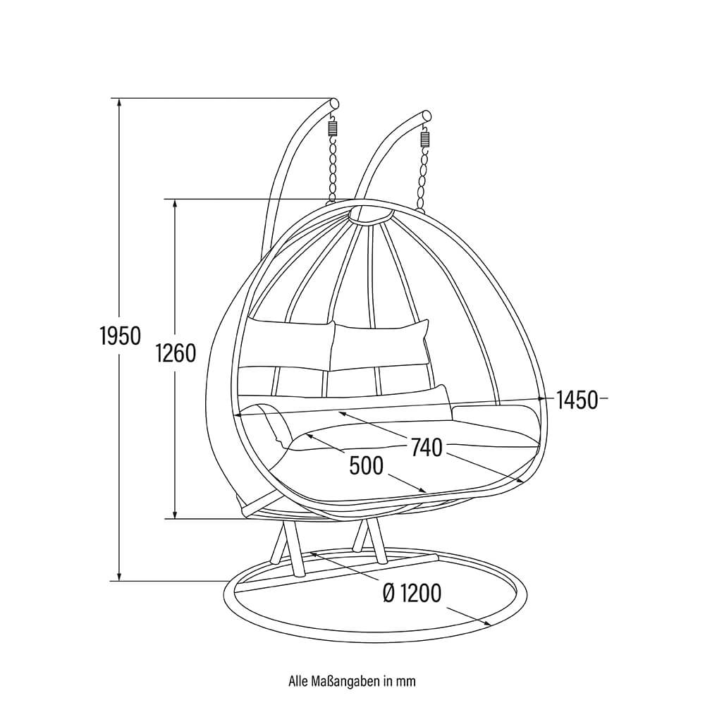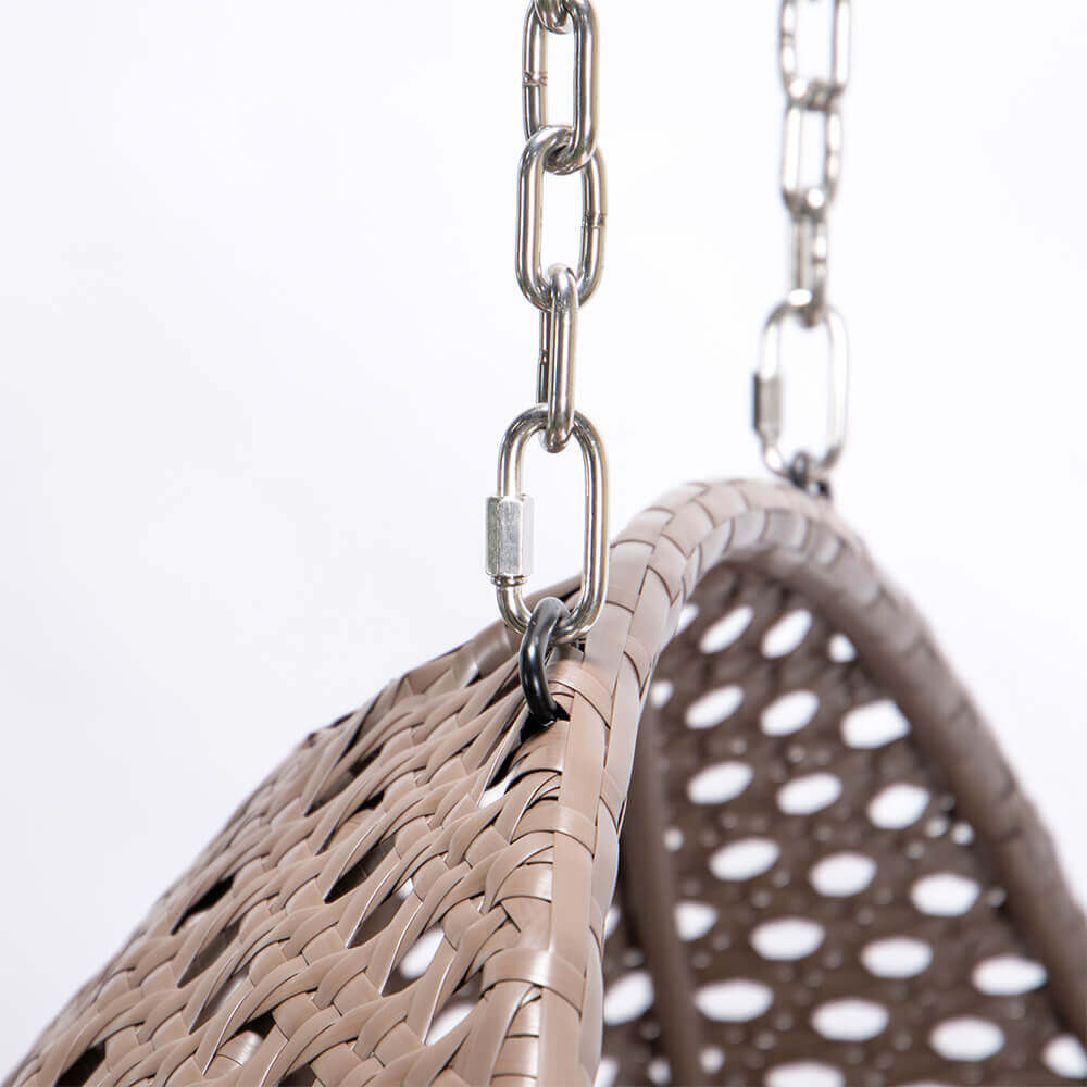 Egal ob drinnen oder draußen, in dem Rattan-Hängesessel TWIN bist du bestens aufgehoben. Nutze den Platz aus und mache es dir allein oder zu zweit gemütlich. Mit den leichten Schwingungen versetzt dich unser Hängesessel in einen angenehmen Zustand der Ruhe, lass dich einfach treiben. Der freischwingende Hängesessel ist äußerst strapazierfähig und wetterbeständig. Elegant geformt und in einem grau-braun gehalten, passt er in jedes Ambiente. Das Metallgestell ist standsicher und extra stabil ausgeführt, während die zwei gefederten Aufhängungen diesen Sessel noch komfortabler machen. Einmal Platz genommen, wirst du diesen Hängesessel nicht mehr missen wollen.